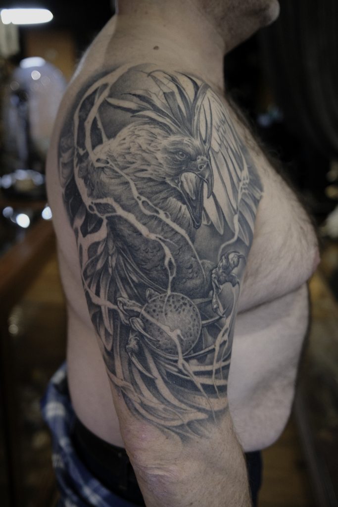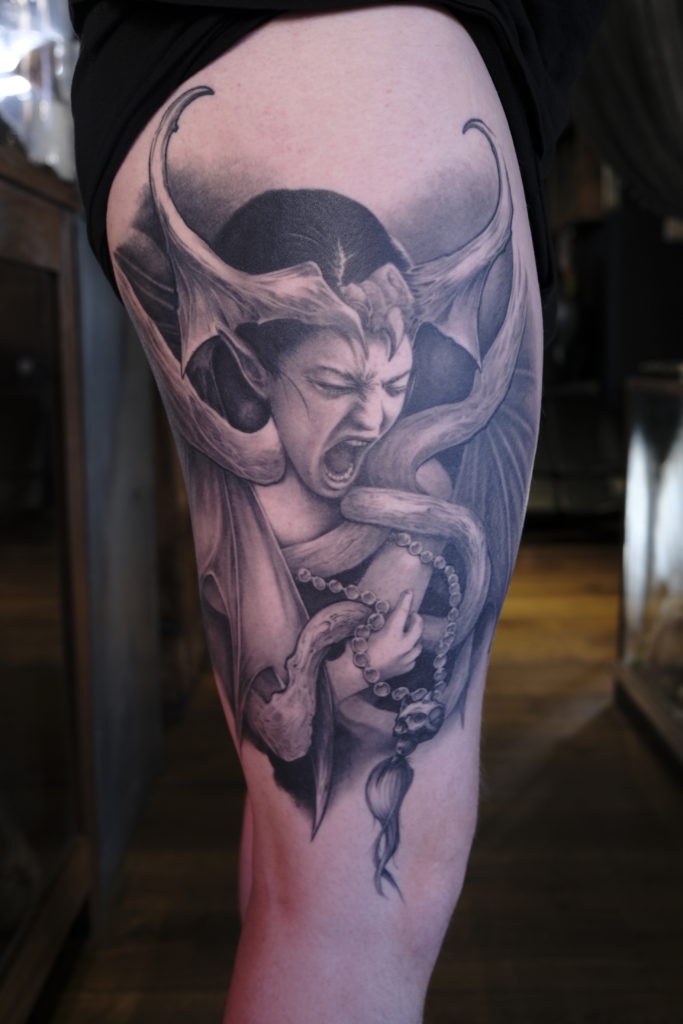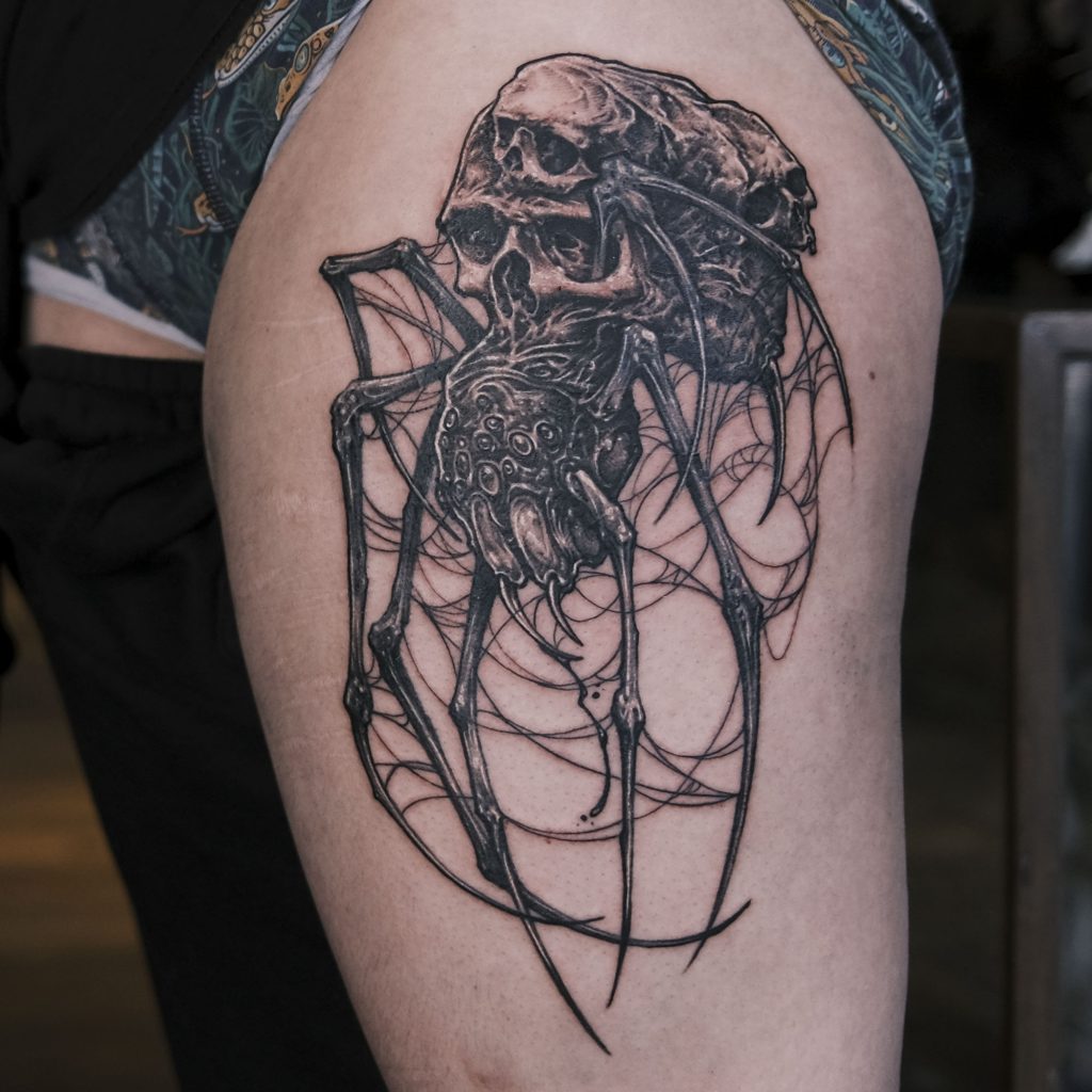 I was intrigued by the craft early on, and it grew more especially as I explored music and saw people in bands with these full sleeves and crazy pieces of art like Kerry King of Slayer. Early on I was drawn to the darker side of the craft and I had to consume all I could find. Getting your foot in the door wasn’t as was as it is now. I was already lucky enough to be tattooed by Liorcifer at Last Rights, and soon after stumbled in to work by Tommy Lee Wendtner, we spoke online and I visited him to start a sleeve project with him in Cologne, Germany. I took my portfolio along and he saw something in my work, he opened up a studio and took me on to work in h’s studio to learn and has been a huge support and mentor ever since.