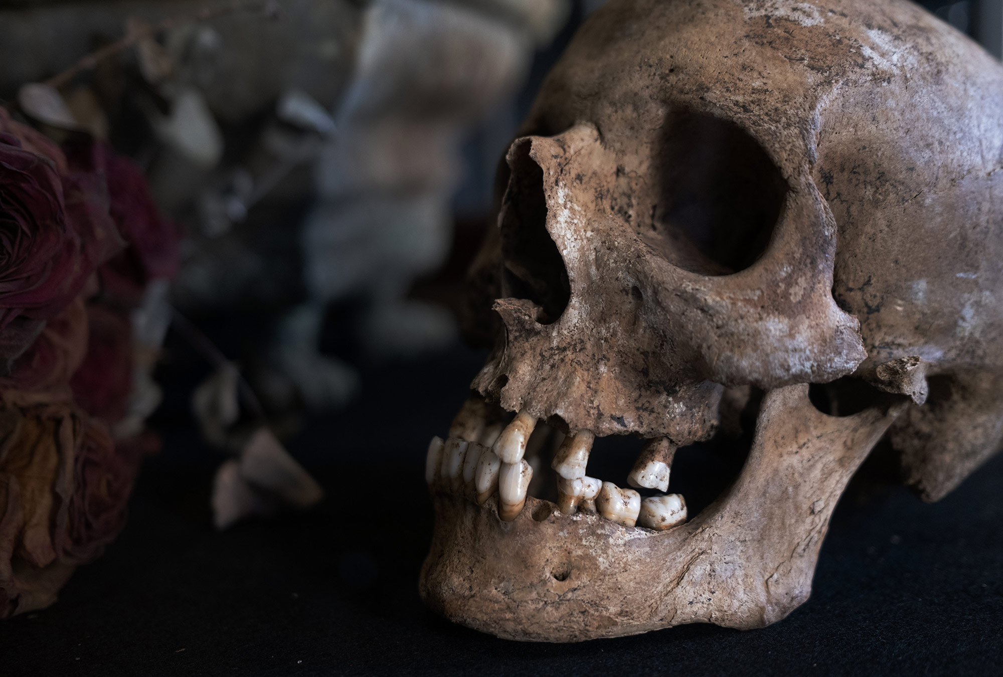 The studio is home to multiple human skulls. The ones in this image in particular are kept in a cabinet as they are particularly fragile. The one on the right still has part of the burial shroud attached to the skull. We don’t know the exact date of the skulls, however we believe they are at least 200 years old.