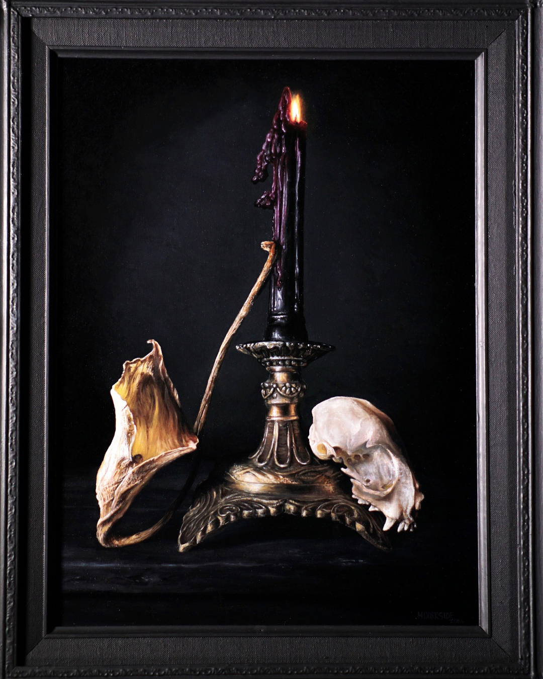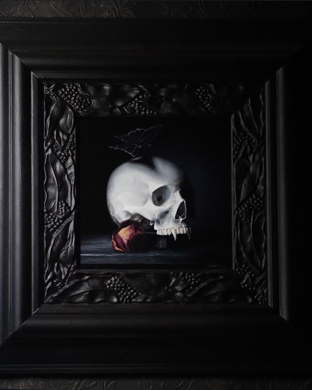 Martin Woodhead is a UK based artist whose work explores the shadows of the human experience through the medium of oil painting. Martin’s deep-rooted fascination for dark imagery, has led him to the Vanitas tradition of Dutch still-life painting, where every detail tells a story—often of fragility, transience, and the inevitable passage of time.
